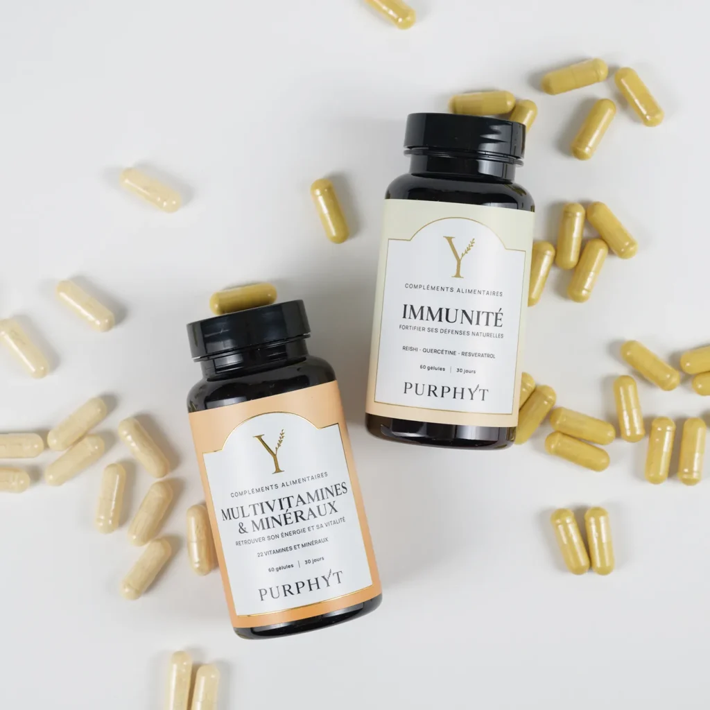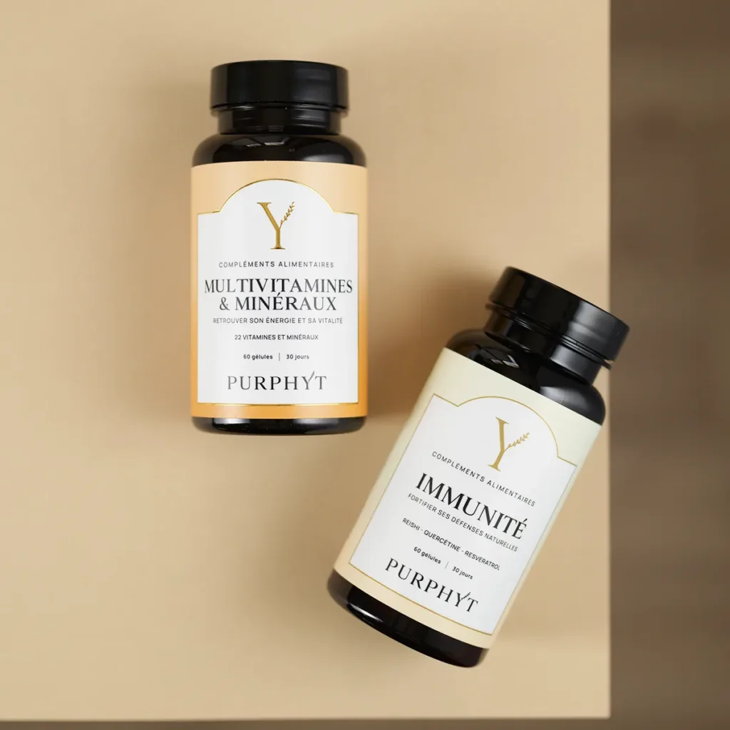 Ce duo réunit deux formules complémentaires : – Les Multivitamines Purphyt, pour fournir l’ensemble des vitamines et minéraux essentiels dont le corps a besoin pour produire de l’énergie, réduire la fatigue et soutenir le système nerveux au quotidien. – Et le complexe Immunité, qui associe des vitamines, des minéraux, des plantes adaptogènes comme le reishi et l’astragale et des extraits végétaux comme le thé vert ou le resvératrol, afin de soutenir les défenses immunitaires et de protéger les cellules contre le stress oxydatif. Face à une alimentation parfois déséquilibrée, au manque de sommeil et aux changements de saison, nos réserves nutritionnelles peuvent rapidement s’épuiser. Le Duo Vitamines apporte une réponse simple et complète : soutenir votre énergie, renforcer vos défenses naturelles, et aider votre organisme à rester équilibré, même quand le quotidien s’accélère.Votre corps a besoin d’un soutien solide pour rester en forme face aux longues journées, au stress du quotidien et aux changements de saison.