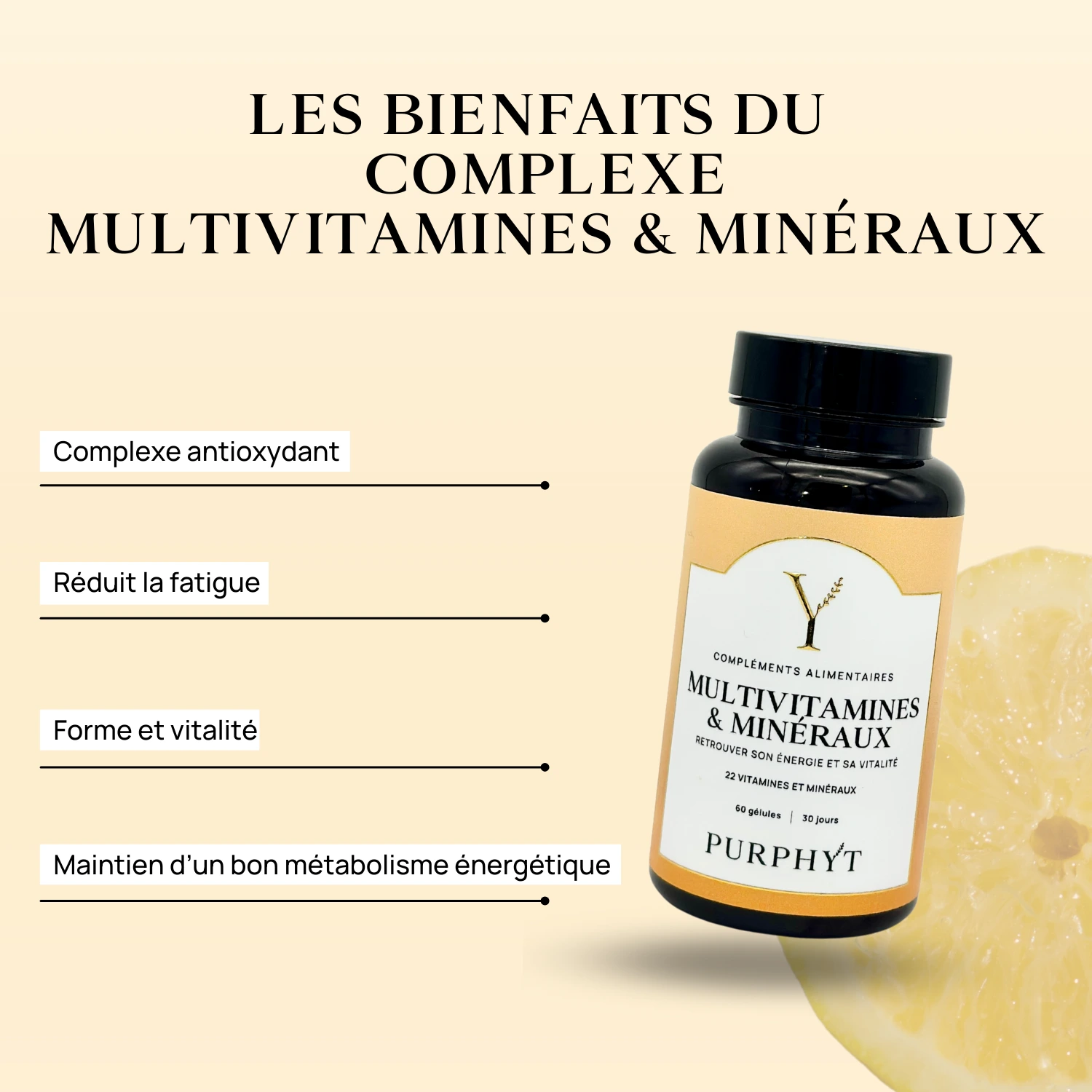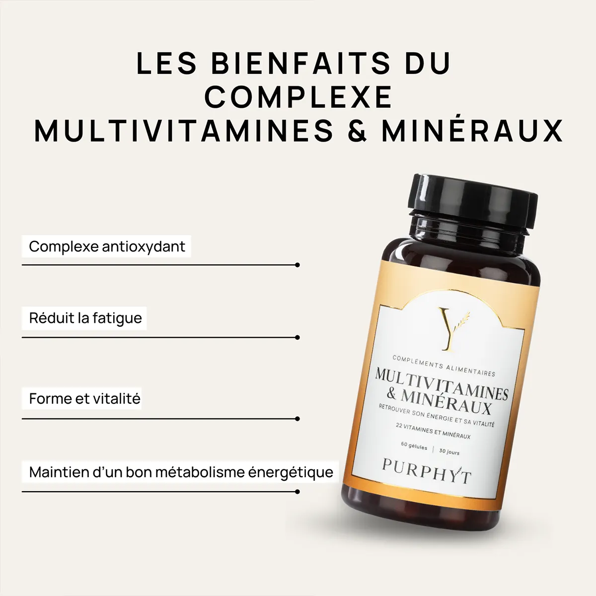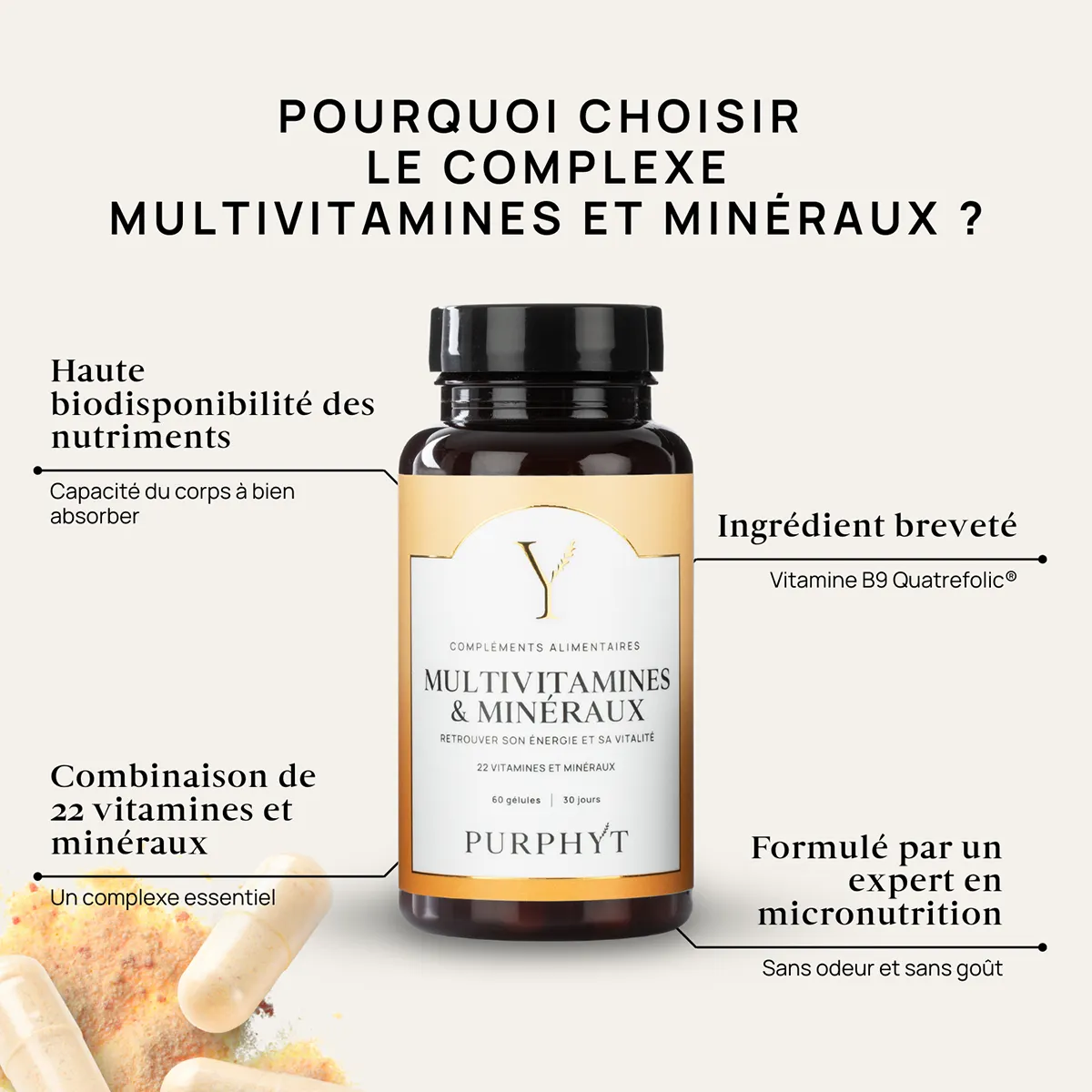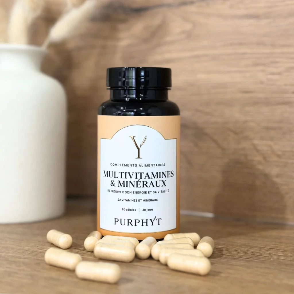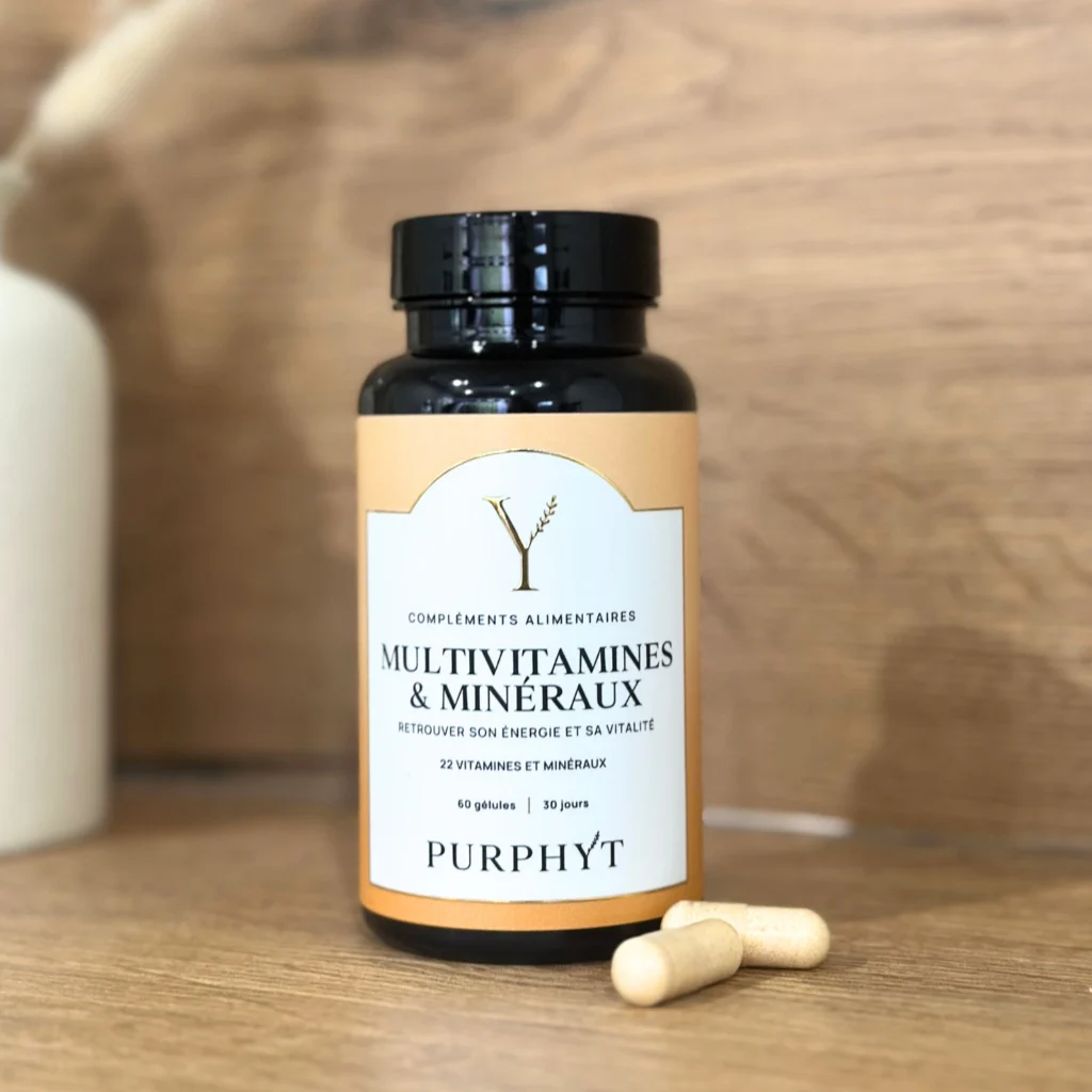 Grâce à ses micronutriments essentiels, le Multivitamines et Minéraux Purphyt va vous aider à garder un niveau d’énergie optimal au quotidien et soutenir le bon fonctionnement global de votre organisme. > Synergie de vitamines et minéraux > Soutien polyvalent > Complexe antioxydant > Actifs biodisponibles > Efficacité scientifiquement prouvée 🌿 Énergie et vitalité 🌿 Défenses immunitaires 🌿 Équilibre physiologiqueLes vitamines et minéraux, qu’on appelle aussi les micronutriments, jouent un rôle essentiel dans le bon fonctionnement de notre organisme. Notre corps est capable d’en synthétiser une partie, mais c’est dans notre alimentation que l’on va en puiser la plus grande quantité.